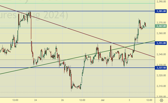 Пока не удается продавцам протолкнуть рынок хотя бы к 2250, что вызывает вопросы. Видимо, сил нет вовсе. Никто не готов отдавать по 2350 и пробиваться вниз. На относительно спокойном фоне рост золота порождает мысли о том, что мы не видим всей картины: что-то происходит за кулисами. Если мы не сможем развернуться вниз, и уйдем выше 2420, то это может вызвать новый раунд скупки драгоценного металла.