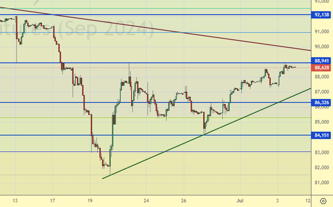 Рост выше 89000 вызовет ход к 90000. Ход к 90000 будет последним шансом рубля на укрепление. Если закрепимся выше 90000, то это приведет к слому падающей тенденции. Тогда можно будет говорить о постепенном ходе в район 95000. Рубль никак не реагирует на клятвенные обещания ЦБ поднять ставку до 18%. Инфляция разгоняется в России: 0.65% за неделю это плохо.