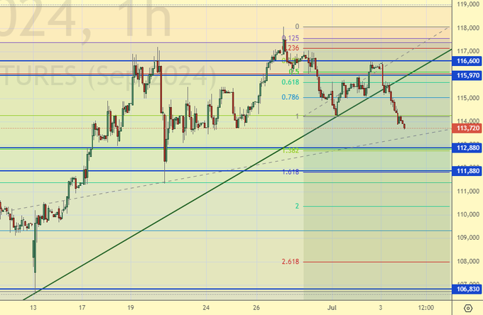 Видим реализацию варианта с ходом к 112000, что говорит нам о том, что рост к 118000 был некой провокацией. Имеет смысл держать шорт, но пододвинем стоп-ордера по тренду.