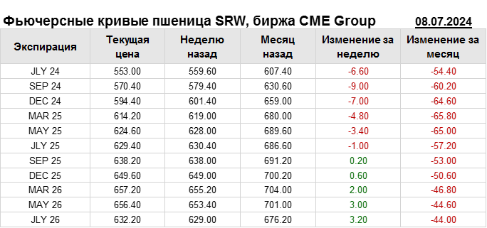 На 08.07.2024 стоимость пшеницы SRW на бирже CME Group по контракту JLY 24 составила 553 цента за бушель. За прошедшую неделю стоимость пшеницы SRW упала на 6.6 цента/бушель. Как мы видим на графике, фьючерсная кривая имеет периоды, когда более дальний фьючерс дешевле ближнего. Состояние бэквардации наблюдаем на следующих контрактах: MAY 26; JLY 26. Таким образом, трейдеры предполагают, что возможно превалирование предложения над спросом в указанные периоды.