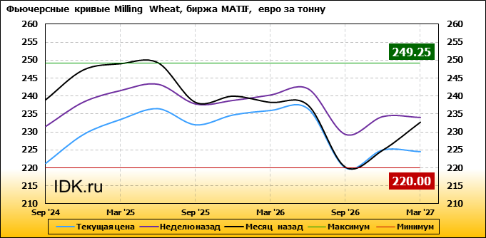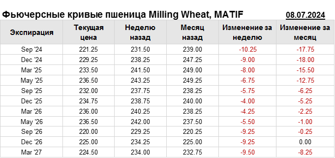 На 08.07.2024 стоимость пшеницы Milling Wheat на бирже MATIF по контракту Sep ’24 составила 221.25 евро за тонну. За прошедшую неделю стоимость пшеницы Milling Wheat упала на 10.25 евро/тонна. Как мы видим на графике, фьючерсная кривая имеет периоды, когда более дальний фьючерс дешевле ближнего. Состояние бэквардации наблюдаем на следующих контрактах: Sep ’25; Sep ’26; Mar ’27. Таким образом, трейдеры предполагают, что возможно превалирование предложения над спросом в указанные периоды.