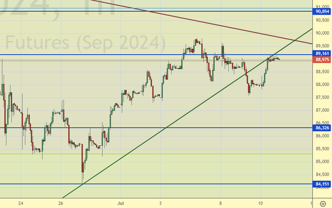 Продажа: нет. Кто в позиции от 88678, держите стоп на 89300. Цель: 75000.