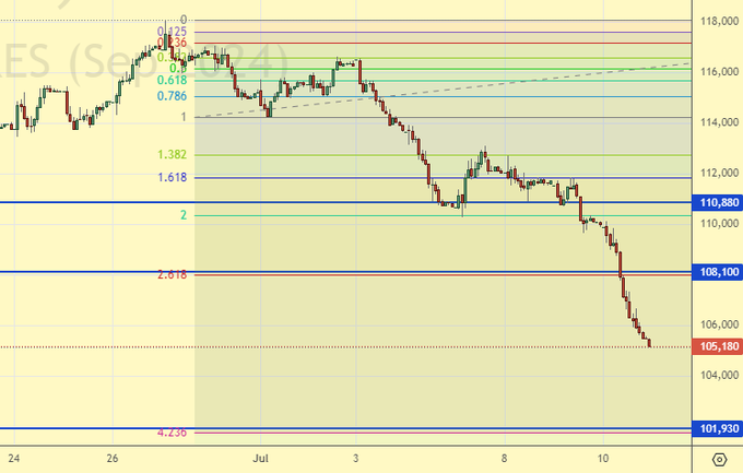 Продажа: нет. Кто в позиции от 116600 и 115510, перенесите стоп на 106200. Цель: 102000.