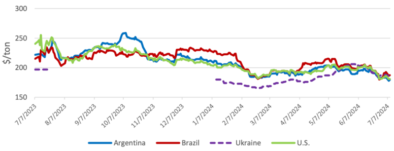 Предложения Аргентины снизились на 15 долларов за тонну до 195 долларов. Бразильские предложения снизились на 16 долларов за тонну до 203 долларов. Сбор шафриньи продолжается в Бразилии, достигнув 61,1 процента по состоянию на неделю, закончившуюся 7 июля, согласно Conab. Украинские предложения снизились на 17 долларов за тонну до 186 долларов.