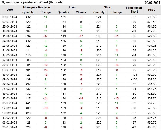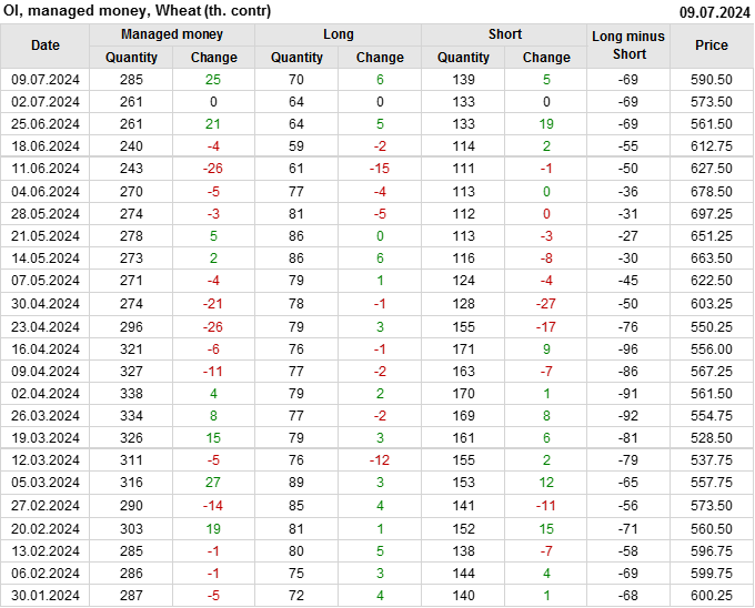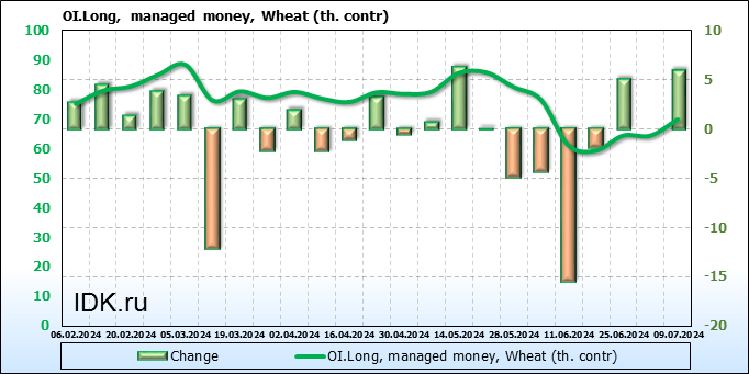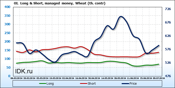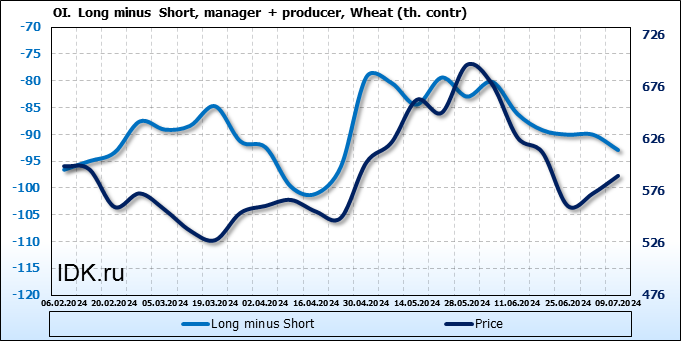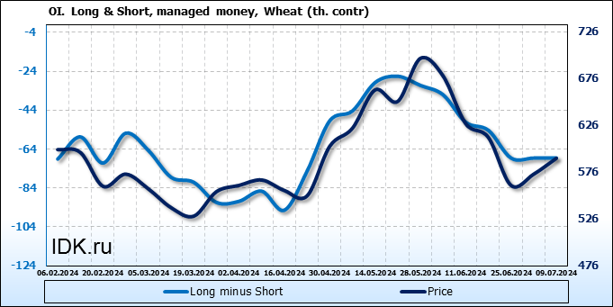 За прошедшую неделю, 03.07.24 — 09.07.24, разница между длинными и короткими позициями управляющих сократилась на 0.1 тыс. контрактов. В тоже время, цена выросла на 17 центов.