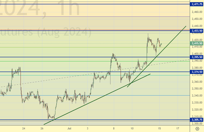 Продажа: при падении ниже 2400. Стоп: 2423. Цель: 2120.