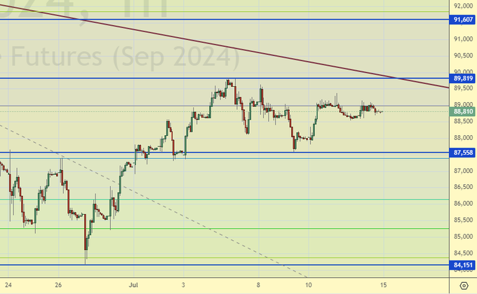 Продажа: нет. Кто в позиции от 89000, держите стоп на 89400. Цель: 75000.