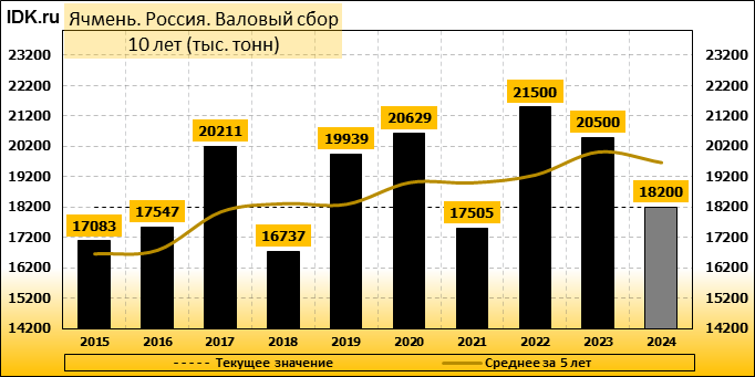 Валовый сбор: оценка пересмотрена в сторону понижения до 18200 тысяч тонн. Показатель упал на -4.21 процента.
