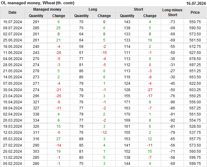 За прошедшую неделю, 10.07.24 — 16.07.24, разница между длинными и короткими позициями управляющих увеличилась на 4.1 тыс. контрактов. В тоже время, цена упала на 39.75 цента.
