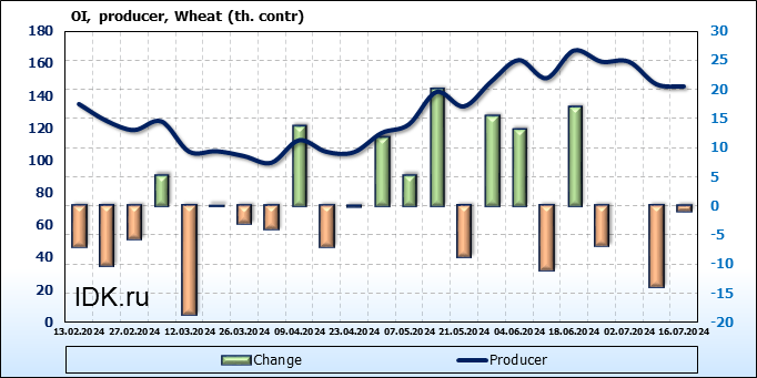Открытый интерес производителей упал на 1 тыс. контрактов. Объем контрактов, направленных на хеджирование, составляет 145 855 штук. Деньги производителей в течение прошлой недели уходили с рынка не видя привлекательности в текущей ситуации.