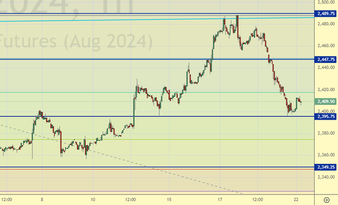 Какой нервный рыночек. Нас мотает из стороны в сторону. При этом мы упали очень быстро: 100 долларов за пару дней. Учитывая 31-е июля, заседание ФРС, есть резон предположить, что трейдеры не смогут закрепить котировки ниже 2400 до следующей среды. Вряд ли какой-то день закроется ниже данного уровня.