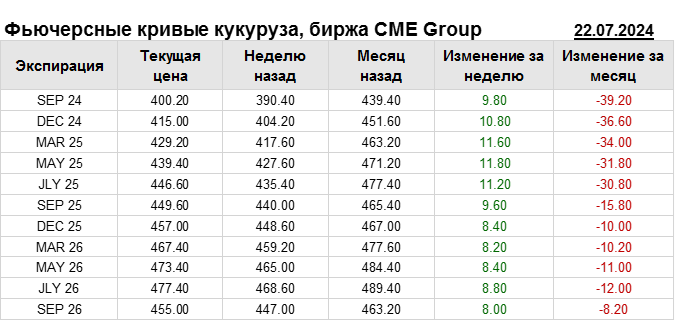 На 22.07.2024 стоимость кукурузы на бирже CME Group по контракту SEP 24 составила 400.2 цента за бушель. За прошедшую неделю стоимость кукурузы на площадке CME Group выросла на 9.8 цента/бушель. Как мы видим на графике, фьючерсная кривая имеет периоды, когда более дальний фьючерс дешевле ближнего. Состояние бэквардации наблюдаем на следующих контрактах: SEP 26. Таким образом, трейдеры предполагают, что возможно превалирование предложения над спросом в указанные периоды.