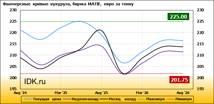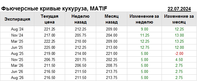 На 22.07.2024 стоимость кукурузы на бирже MATIF по контракту Aug ’24 составила 221.25 евро за тонну. За прошедшую неделю стоимость кукурузы на европейской площадке выросла на 9 евро/тонна. Как мы видим на графике, фьючерсная кривая имеет периоды, когда более дальний фьючерс дешевле ближнего. Состояние бэквардации наблюдаем на следующих контрактах: Nov ’24; Aug ’25; Nov ’25. Таким образом, трейдеры предполагают, что возможно превалирование предложения над спросом в указанные периоды.