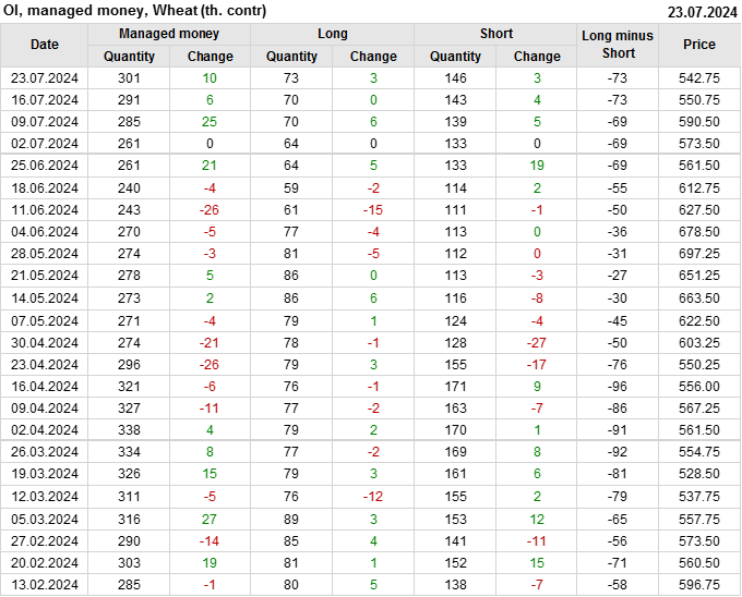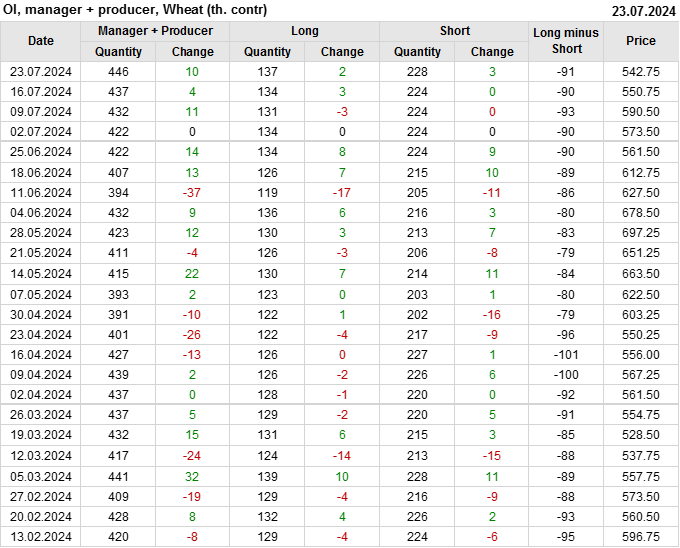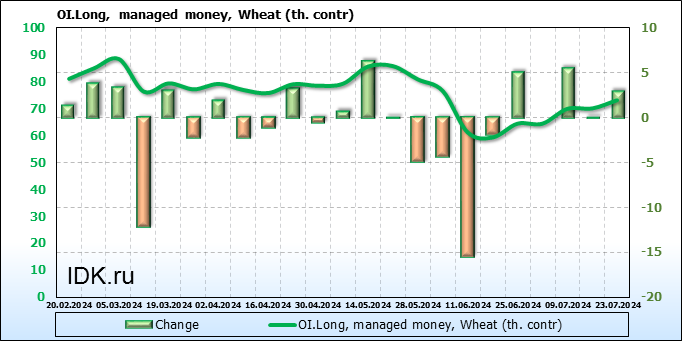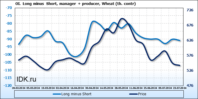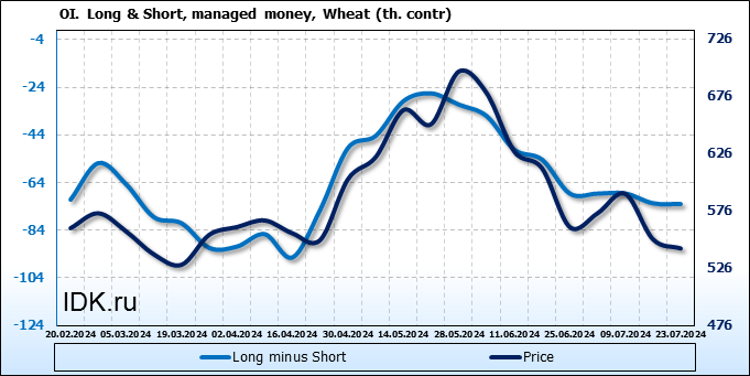 За прошедшую неделю, 17.07.24 — 23.07.24, разница между длинными и короткими позициями управляющих увеличилась на 0.3 тыс. контрактов. В тоже время, цена упала на 8 центов.