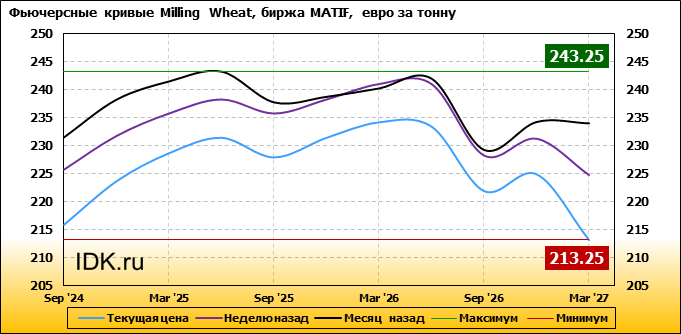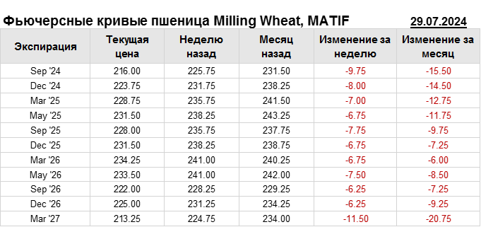 На 29.07.2024 стоимость пшеницы Milling Wheat на бирже MATIF по контракту Sep ’24 составила 216 евро за тонну. За прошедшую неделю стоимость пшеницы Milling Wheat упала на 9.75 евро/тонна. Как мы видим на графике, фьючерсная кривая имеет периоды, когда более дальний фьючерс дешевле ближнего. Состояние бэквардации наблюдаем на следующих контрактах: Sep ’25; May ’26; Sep ’26; Mar ’27. Таким образом, трейдеры предполагают, что возможно превалирование предложения над спросом в указанные периоды.