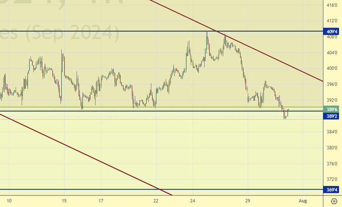 Итак, 390.0 у нас проверяется на прочность. Мы уже под этим уровнем, но можем вернуться выше сегодня. Если падение продолжится, то следующая цель 30.0. Потом 330.0.
