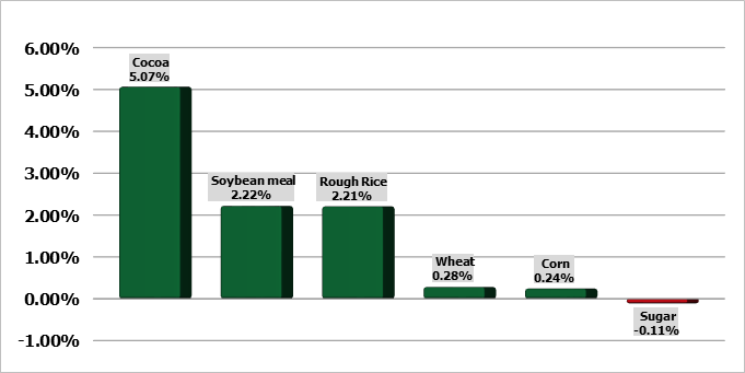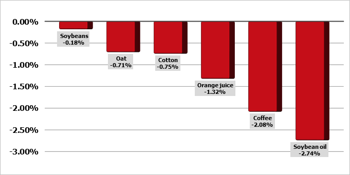 Соевые бобы торговались с приростом в понедельник от 2 до 7 центов. Фьючерсы на соевую муку упали на 2 доллара за тонну на сессии по сентябрьскому контракту. Фьючерсы на соевое масло упали на 49 пунктов по сентябрьскому контракту. Отчет FGIS Export Inspections Министерства сельского хозяйства США показал, что поставки за неделю, закончившуюся 1 августа, составили 261 203 тонн (9,56 млн бушелей). Это на 10,2% меньше, чем за ту же неделю прошлого года, и на 36,1% меньше, чем за предыдущую неделю. Индонезия была ведущим пунктом назначения с 85 629 тонн, поскольку 76 838 тонн были направлены в Мексику.