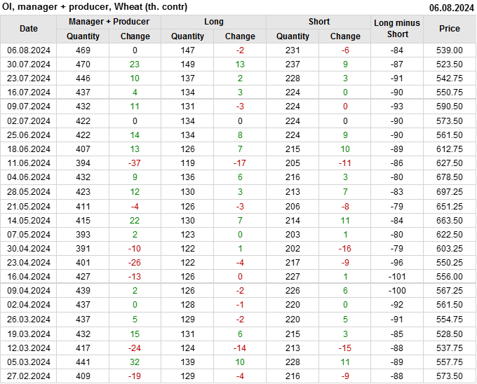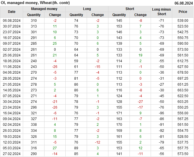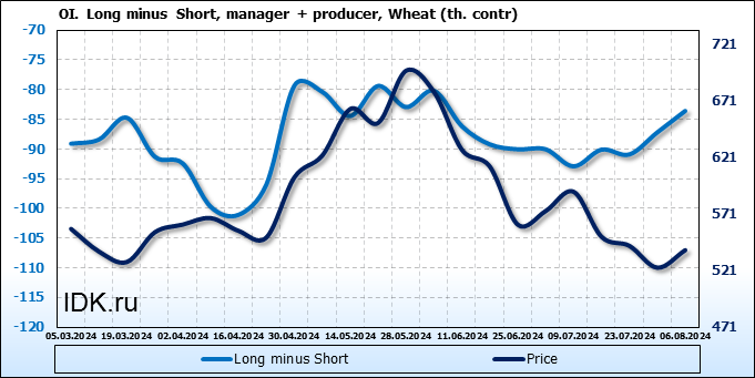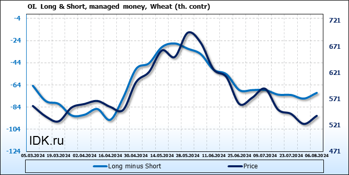 За прошедшую неделю, 31.07.24 — 06.08.24, разница между длинными и короткими позициями управляющих сократилась на 5.2 тыс. контрактов. В тоже время, цена выросла на 15.5 цента.