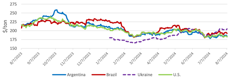 После июльского отчета WASDE экспортные заявки всех основных экспортеров выросли. Заявки США претерпели наименьшие изменения, всего на 1 долл. за тонну до 182 долл., и в настоящее время являются наиболее конкурентоспособными по цене в ожидании обильных поставок. По оценкам NASS, на неделю, заканчивающуюся 4 августа, 67 процентов урожая кукурузы будут в хорошем или отличном состоянии по сравнению с 68 процентами неделей ранее и 57 процентами годом ранее. Украинские заявки выросли на 19 долл. за тонну до 205 долл. Жаркая, сухая погода в Украине может повлиять на ожидания поставок для предстоящего урожая. Бразильские заявки выросли на 5 долл. за тонну до 192 долл., а аргентинские — на 4 долл. за тонну до 184 долл. Продажи и экспорт фермерской продукции в обеих странах были вялыми.