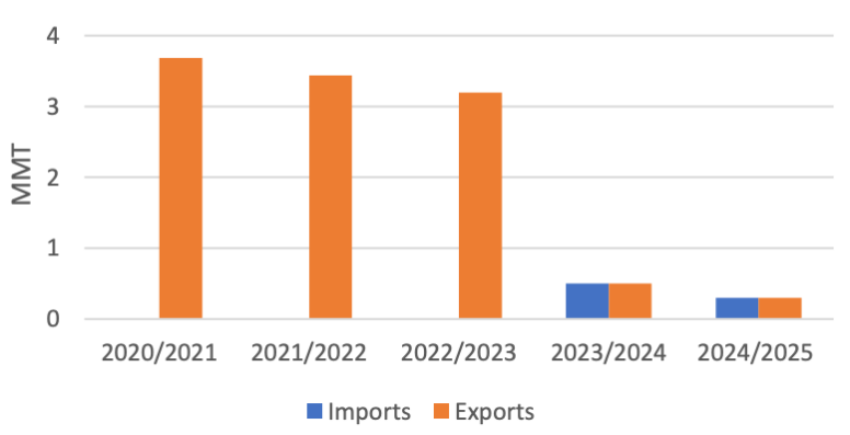 Резкий рост внутреннего спроса на кукурузу в Индии резко сократил экспорт и привел к рекордному импорту в 2023/24 TY (октябрь-сентябрь). Факторами, обусловившими этот рост спроса, являются государственная политика в отношении этанола и растущий рынок птицы. Исторически Индия была чистым экспортером, поставляющим значительные объемы кукурузы в Южную и Юго-Восточную Азию. Впервые с 1999/00 Индия импортирует столько же кукурузы, сколько экспортирует.