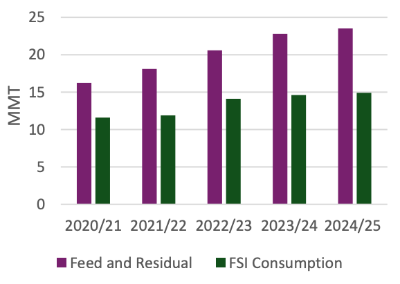 Ожидается, что внутренний спрос останется высоким в 2024/25 году на фоне продолжающегося спроса со стороны секторов этанола и кормов. Индия попытается достичь целевых показателей Программы смешивания этанола с бензином (EBP) и пока не указала, когда будут сняты ограничения на сахар в этаноле. Прогнозируется, что экспорт на 200 000 тонн ниже, чем в 2023/24 году, что представляет собой долгосрочный сдвиг в торговой среде Индии, поскольку эти факторы продолжают сохраняться.