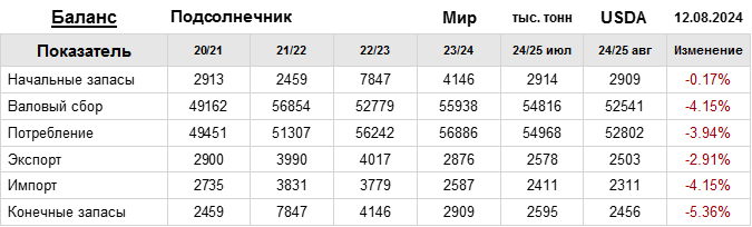 За прошедший месяц министерство сельского хозяйства США (USDA) на 12.08.2024 пересмотрело Баланс подсолнечника для Мира в сезоне 24/25 следующим образом:
