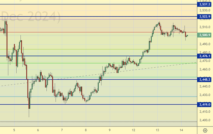 Как и вчера мы продолжим проявлять осторожность. Ясно, что ничего не понятно. Рынок снова у 2500, что делает возможным прямой ход на 3000, но для этого надо проходить через район 2550, а этого пока не произошло. Крайне запущенная история у нас уже на самом деле, в широком, почти в 170 долларов диапазоне, аж с апреля 2024-го года.