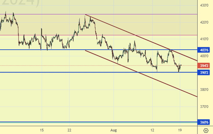 Продажа: нет. Кто в позиции от 409.0 (с учетом перехода на новый контракт), перенесите стоп на 403.0. Цель: 362.0.
