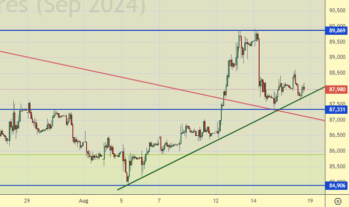 Покупка: нет. Кто в позиции от 85795 и 87717 держите стоп на 87300. Цель: 100000.