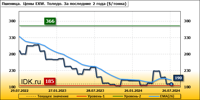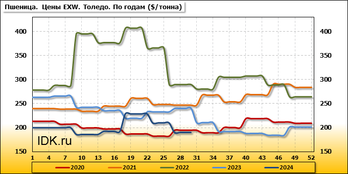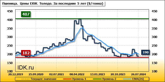 Внутренние цены на пшеницу SRW в городе Толедо (США) упали на 19.9 $/т. и на отчетный месяц составляют 189.89 доллара за тонну.