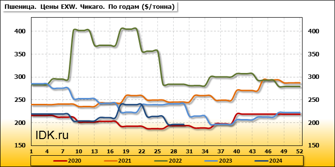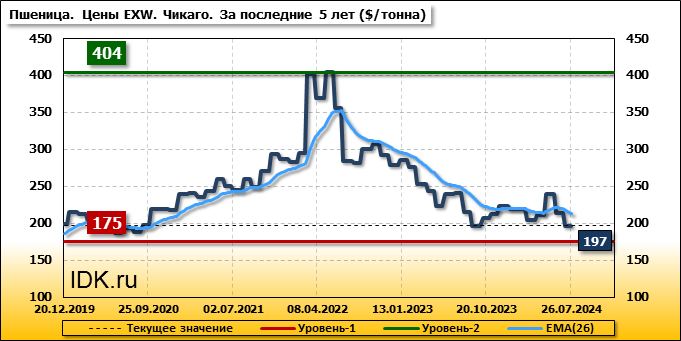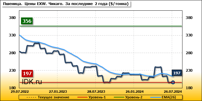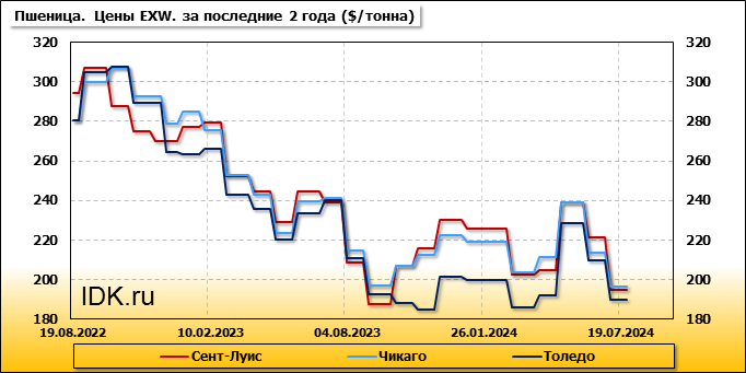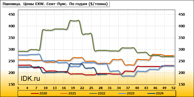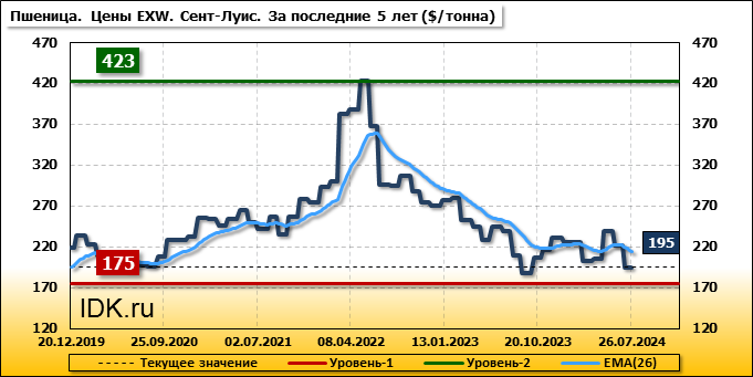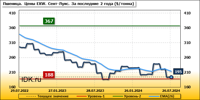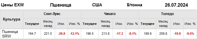 За прошедший месяц внутренние цены на пшеницу SRW в Сент-Луисе (США) упали на 26.9 $/т. и на отчетный месяц составляют 194.67 доллара за тонну.