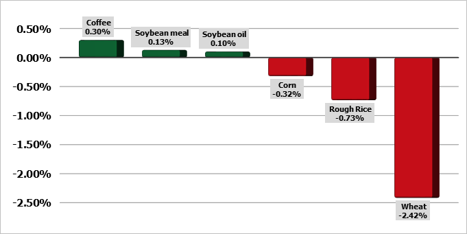Пшеница продемонстрировала потери на сессии в середине недели. Фьючерсы Chicago SRW упали на 10–12 ½ центов за первые месяцы. KC HRW упали на 10–11 центов в ближайшие месяцы. Яровая пшеница MPLS упала на 8–10 центов. Не только фьючерсы США испытывали давление, поскольку фьючерсы на французскую мукомольную пшеницу снижались в среду. Ожидается, что отчет об экспортных продажах в четверг утром покажет от 250 000 до 500 000 тонн продаж за неделю, которая закончилась 15 августа, согласно опросу аналитиков Reuters. Южнокорейские импортеры закупили 50 000 тонн американской пшеницы на своем тендере в среду. Министерство сельского хозяйства Украины предложило экспортный лимит в размере 16,2 млн тонн для пшеницы в 2024/25 году на период с 1 июля по 30 июня.