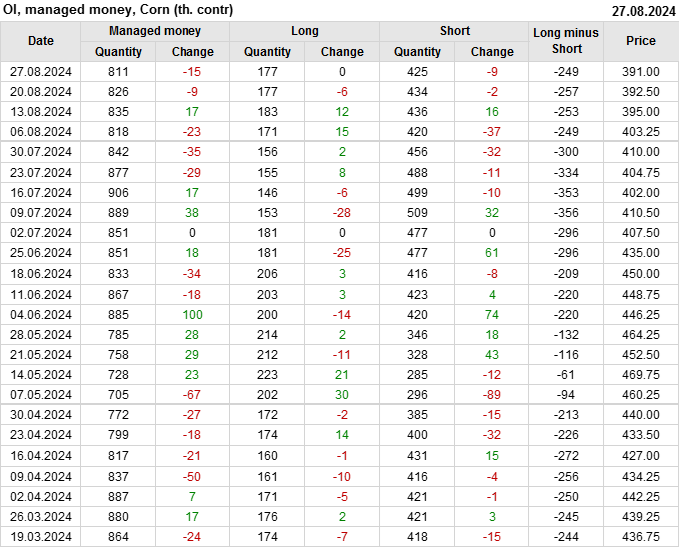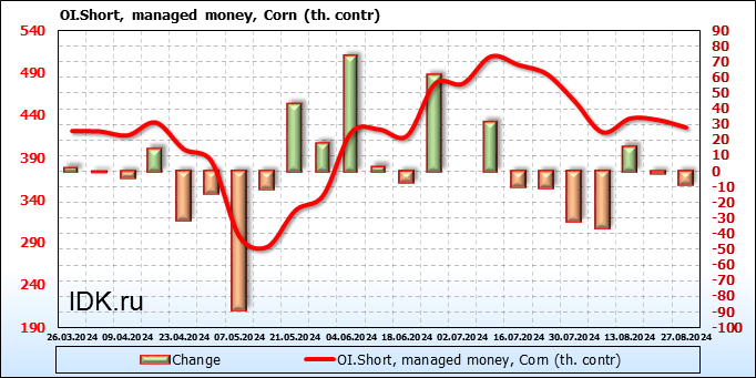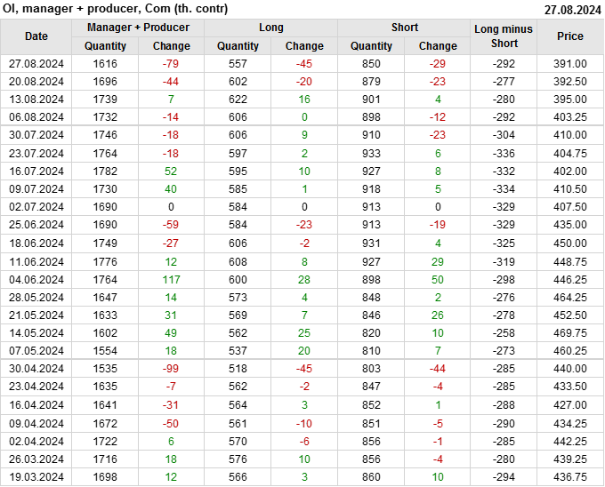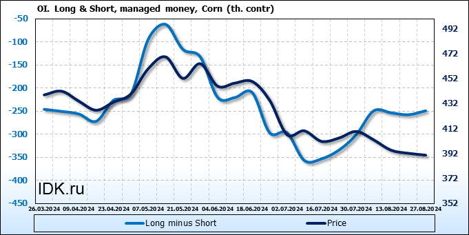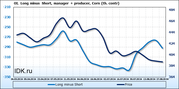 За прошлую неделю, 21.08.24 — 27.08.24, разница между длинными и короткими позициями управляющих сократилась на 8.6 тыс. контрактов. В тоже время, цена упала на 1.5 цента.