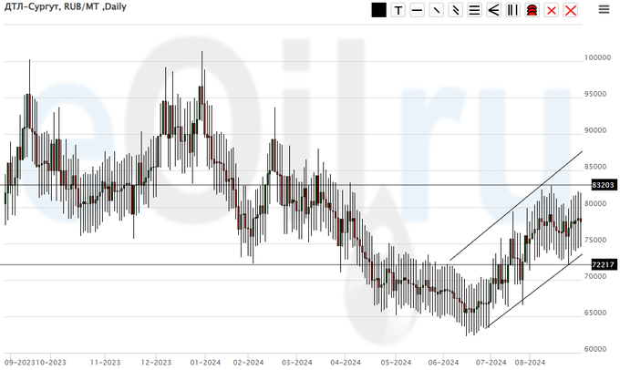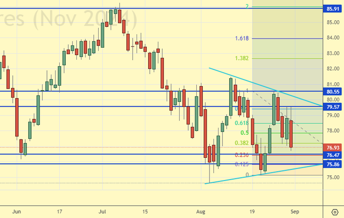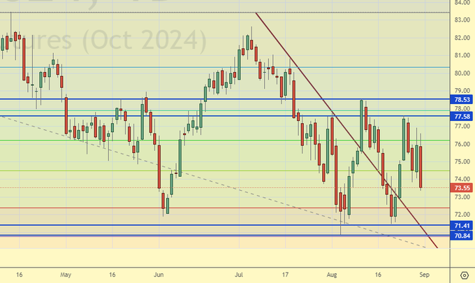 Сценарий роста: рассматриваем ноябрьский фьючерс, дата экспирации 30 сентября. Пока можно искать возможности для покупок. Стоит признать, что падение ниже 75.00 приведет к спуску к 70.00.