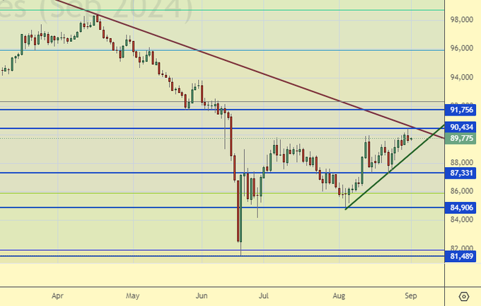 Сценарий роста: рассматриваем сентябрьский фьючерс, дата экспирации 19 сентября. Продолжаем не верить в рост российского рынка в долларах. Да, лонг от района 87000 возможен, но надо всё очень хорошо взвесить для такого шага. Явной рекомендации от нас на эту покупку от нас пока не будет.