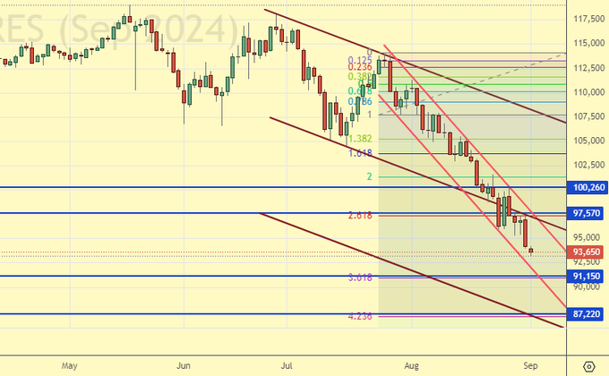 Сценарий падения: будем держать шорт. Мы закрепились под 97600. Должны пройти в район 87000. Отметим, что падение ниже 87000 может вызвать панику и сброс бумаг. Перспективы на 2025-й год лучше не озвучивать. Почему? Потому что их нет. Рост ВВП на 0.5% – это ничего. Это пустота.