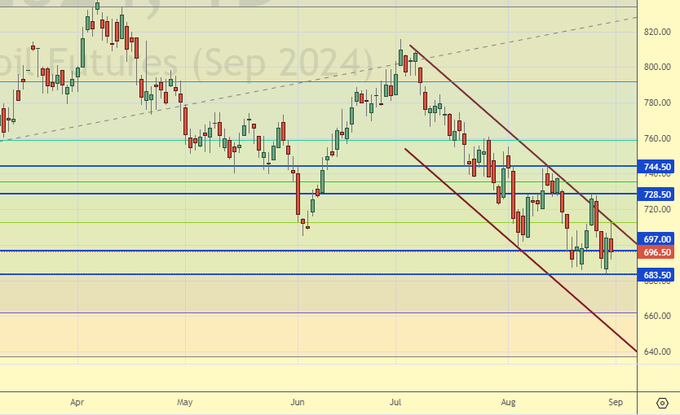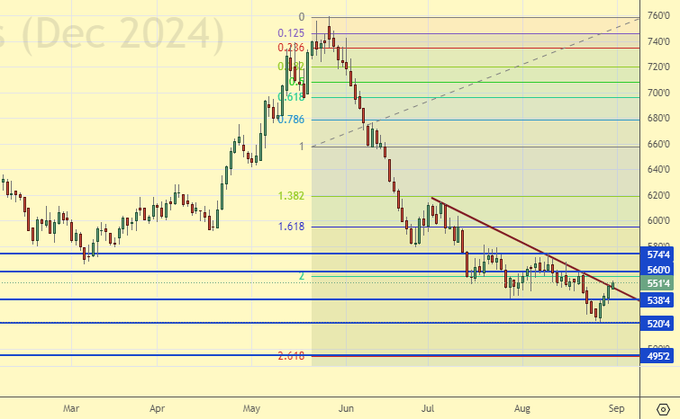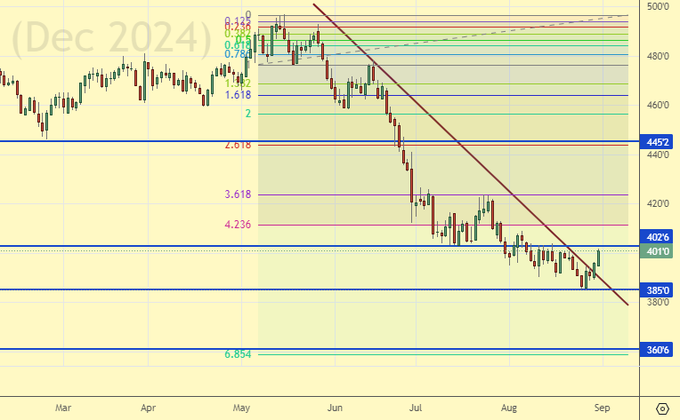 Рынок пшеницы к сентябрю подошел в неплохой форме. Мы не видим уровня 500.0, о котором размышляли ранее. Несмотря на хороший, но вряд ли рекордный объем, цены не торопятся порадовать нас, как будущих покупателей, низкими уровнями, что вызывает желание начать процесс постепенной загрузки бычьей позиции уже сейчас. Как мы уже неоднократно отмечали, рынок зерновых, и, в частности, пшеницы, далек от насыщения. Если мы не будем видеть прироста объемов валового сбора каждый год, то застой уже может стать причиной роста цен, так как спрос всё время растет.