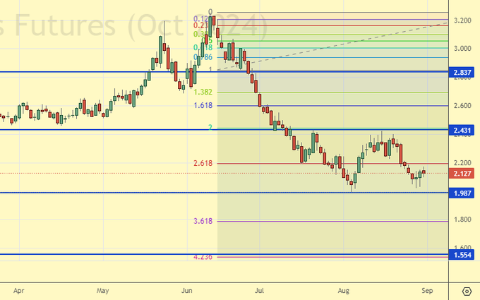 Сценарий роста: рассматриваем сентябрьский фьючерс, дата экспирации 12 сентября. Интересно подержать здесь лонг. Найдет ли отклик в Европе атака на Московский НПЗ? Скорее нет, так как экспорт нефтепродуктов из России запрещен. Но трейдеры могут немного дернуть рынок вверх просто на новостной ленте в понедельник.