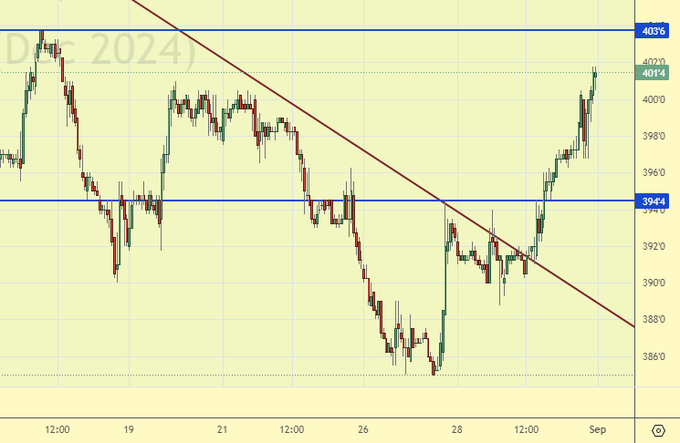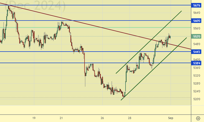 Не порадовал нас рынок новыми минимумами, что наводит на мысли о том, что трейдеры оценивают рапорты с американских и европейских полей как тревожные. В ряде регионов не хватает влаги, что повлияет на валовый сбор и это мы, судя по всему, увидим в сентябрьском отчете USDA. Происходящее заставляет задуматься о постановке позиций на покупку в ближайшие дни, но не сегодня.