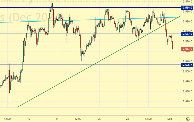 Продажа: нет. Кто в позиции от 2551, перенесите стоп на 2556. Цель: 2120.