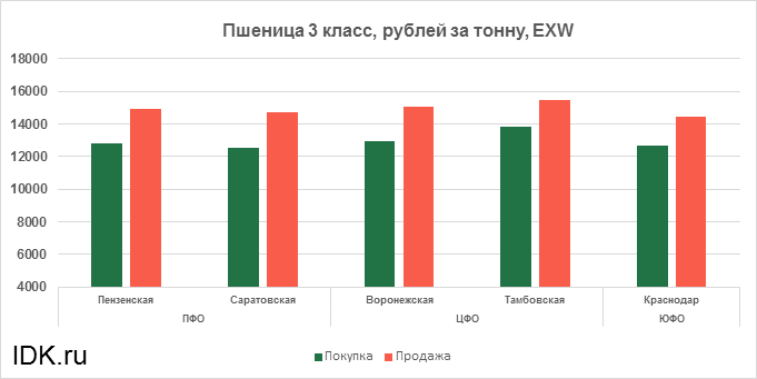 За прошедшую неделю с 26.08.2024 по 30.08.2024 средняя цена на пшеницу 3-го класса, согласно выставленным заявкам трейдеров, выросла по всем округам на 113 рублей. Средняя цена составляет 13857 рублей за тонну.