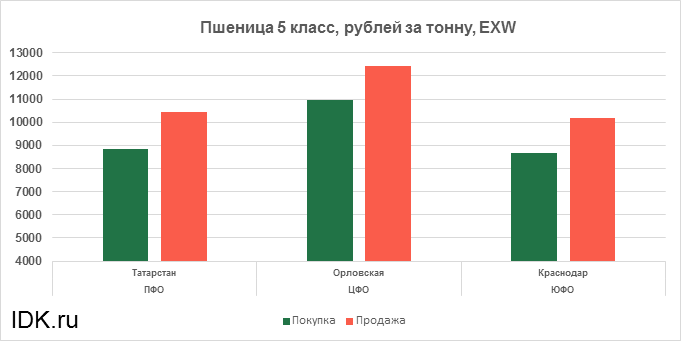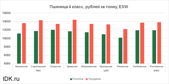 За прошедшую неделю с 26.08.2024 по 30.08.2024 средняя цена на пшеницу 4-го класса, согласно выставленным заявкам трейдеров, упала по всем округам на 208 рублей. Средняя цена составляет 12601 рубль за тонну.