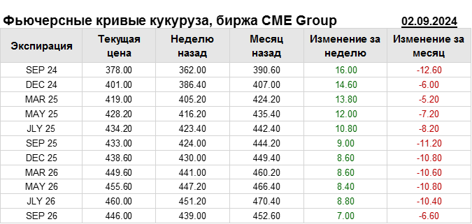 На 02.09.2024 стоимость кукурузы на бирже CME Group по контракту SEP 24 составила 378 центов за бушель. За прошедшую неделю стоимость кукурузы на площадке CME Group выросла на 16 центов/бушель. Как мы видим на графике, фьючерсная кривая имеет периоды, когда более дальний фьючерс дешевле ближнего. Состояние бэквардации наблюдаем на следующих контрактах: SEP 25; SEP 26. Таким образом, трейдеры предполагают, что возможно превалирование предложения над спросом в указанные периоды.
