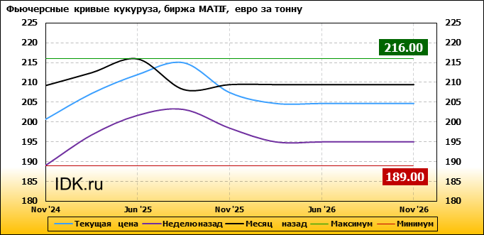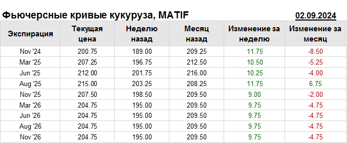 На 02.09.2024 стоимость кукурузы на бирже MATIF по контракту Nov ’24 составила 200.75 евро за тонну. За прошедшую неделю стоимость кукурузы на европейской площадке выросла на 11.75 евро/тонна. Как мы видим на графике, фьючерсная кривая имеет периоды, когда более дальний фьючерс дешевле ближнего. Состояние бэквардации наблюдаем на следующих контрактах: Nov ’25; Mar ’26. Таким образом, трейдеры предполагают, что возможно превалирование предложения над спросом в указанные периоды.