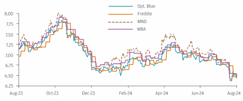Устойчивая инфляция и процентные ставки, долгое время остающиеся на высоком уровне, привели к удорожанию заимствований. Это существенно повлияло на ставки по ипотечным кредитам в США, которые в октябре 2023 года достигли 8% — самого высокого уровня с 2000 года. С тех пор ставки держались в районе 7%, а в августе снизились до 6,44% на фоне опасений рецессии.
