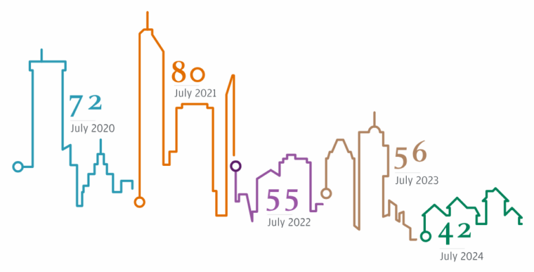 Действительно, общее доверие к рынку жилья остается довольно низким, согласно индексу рыночной стоимости жилья NAHB, который отслеживает общие настроения среди застройщиков. «Индекс практически не изменился в июле, упав до 42 с 43 пунктов в июне. Он снизился с недавнего максимума в 51 пункт в марте/апреле, но с конца 2022 года индекс колеблется в диапазоне, который значительно ниже показателей, существовавших до пандемии. Это, в свою очередь, соответствует влиянию высоких ипотечных ставок на рынок жилья», — добавил Рейнхарт.