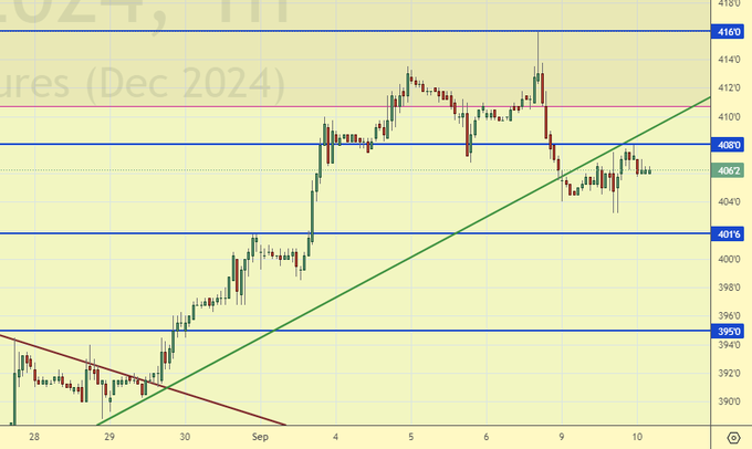 Быки очень сильно хотят наверх, но у них ничего не получается. Возможно будет какое-то движение в среду, когда выйдут данные по индексу потребительских цен. И вот если инфляция окажется выше ожидаемых 2.6%, то золото не вырастет никак, так как перспективы снижения ставки в США станут минимальными.
