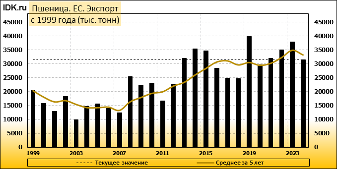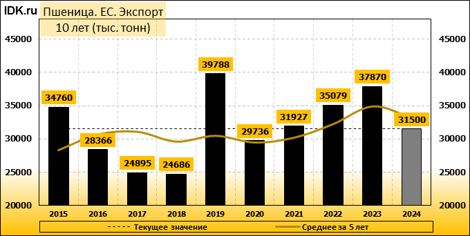 Экспорт: оценивается в 31500 тысяч тонн. За месяц показатель упал на -7.35 процента.