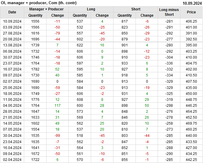 За прошлую неделю, 04.09.24 — 10.09.24, разница между длинными и короткими позициями управляющих сократилась на 41.4 тыс. контрактов. В тоже время, цена выросла на 5.25 цента.