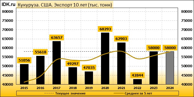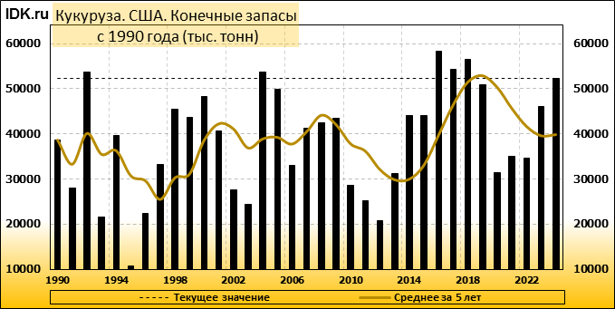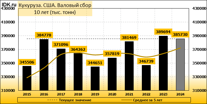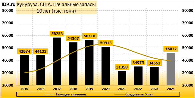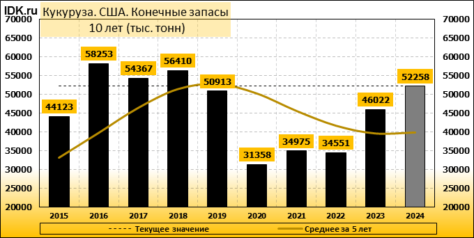 Исходя из оценок USDA по убранным площадям и прогнозируемой урожайности, урожай кукурузы составит 15,1 миллиарда бушелей, а соевых бобов — 4,435 миллиарда бушелей. Рекордными являются 15,342 млрд бушелей кукурузы в 2023 году и 4,465 млрд бушелей сои в 2021 году. Запасы кукурузы и сои заметно больше, чем на данный момент в 2023 году, говорится в ежеквартальном отчете USDA о запасах зерна. По состоянию на 1 июня на складах находилось 4,993 миллиарда бушелей кукурузы и 970 миллионов бушелей соевых бобов, по сравнению с 4,103 миллиарда бушелей кукурузы и 796 миллионов бушелей соевых бобов в июне 2023 года. Увеличение запасов может сдерживать рост цен на сырьевые товары. Урожайность кукурузы и сои в этом году будет самой высокой за всю историю: 181 бушель с акра для кукурузы и 52 бушеля с акра для сои, согласно прогнозам Министерства сельского хозяйства США.